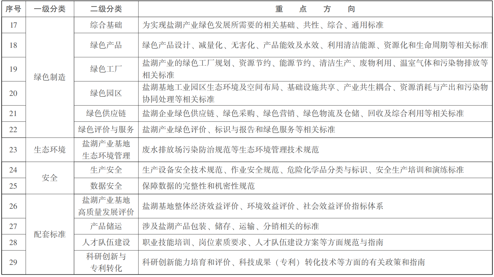 (十)配套标准。配套标准包括盐湖产业基地高质量发展评价标准、产品储运标准、人才队伍建设标准、科研创新与专利转化标准等。盐湖产业基地高质量发展评价方面,包括经济效益评价、环境效益评价、社会效益评价相关标准。盐湖产品储运方面,包括货物包装标准、仓储管理规范、运输设备要求、温湿度控制等涉及产品包装、储存、运输、分销相关标准。人才队伍建设方面,包括职业技能培训、岗位素质要求、人才队伍建设方案等方面规范与指南。科研创新与专利转化方面,包括科研创新能力培育和评价、科技成果(专利)转化技术等方面的指南。