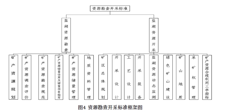 (四)盐湖资源勘查开采标准。盐湖资源勘查开采标准包括盐湖资源勘查与开采标准。盐湖资源勘查方面,包括盐湖资源规划、盐湖资源调查评价、盐湖资源勘查规范、盐湖资源储量估算报告。盐湖资源开采方面,包括矿区总体规划、采矿设计、工艺设计、开采装备、盐湖资源动态监测、绿色矿山建设、矿山地质、采矿权管理、盐湖资源综合利用“三率”指标等相关标准。