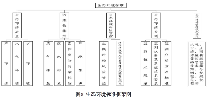 (八)生态环境标准。生态环境标准包括生态环境质量、生态环境风险管控、污染物排放、生态环境监测、生态环境管理技术规范等标准。生态环境质量标准方面,包括大气、水、声等环境质量标准。污染物排放标准方面,包括大气、水污染物排放标准、固体废物污染控制标准、环境噪声排放控制标准等。生态环境风险管控标准方面,包括土壤污染风险管控标准以及法律法规规定的其他环境风险管控标准。生态环境监测标准方面,包括生态环境监测技术规范、生态环境监测分析方法标准、生态环境监测仪器及系统技术要求等。生态环境管理技术规范方面,包括大气、水、土壤、固体废物、化学品等领域的管理技术指南、导则、规程、规范等。