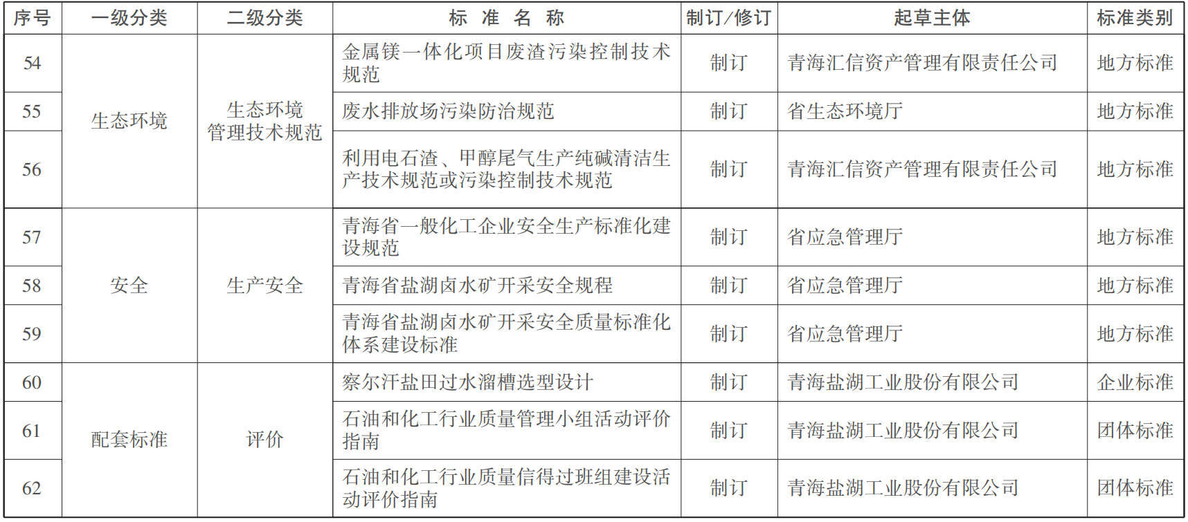 生产安全方面,加快制修订青海省一般化工企业安全生产标准化建设规范、青海省盐湖卤水矿开采安全规程、青海省盐湖卤水矿开采安全质量标准化体系建设等标准,提高盐湖产业基地安全准入条件,规范盐湖各行业安全生产。(省应急管理厅牵头,省工业和信息化厅、省国资委、省市场监管局、海西州政府、柴达木循环经济试验区管委会按职责分工负责)