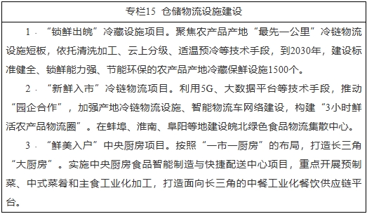 3﹒仓储物流设施建设。聚焦肉类、水果、蔬菜、水产品、乳品、速冻食品等主要生鲜食品,因地制宜开展仓储物流设施建设。重点建设阜阳、蚌埠两大冷链物流核心园区,支持各县(市、区)建设一批集分级包装、预冷仓储、初级加工、集散批发等功能于一体的县级农产品冷链物流基地。升级改造一批乡镇级冷链物流网点,强化产地收集、分类、分装、预冷、保鲜等功能。在田间地头,建设一批具备保鲜、预冷等功能的小型、移动式仓储设施。