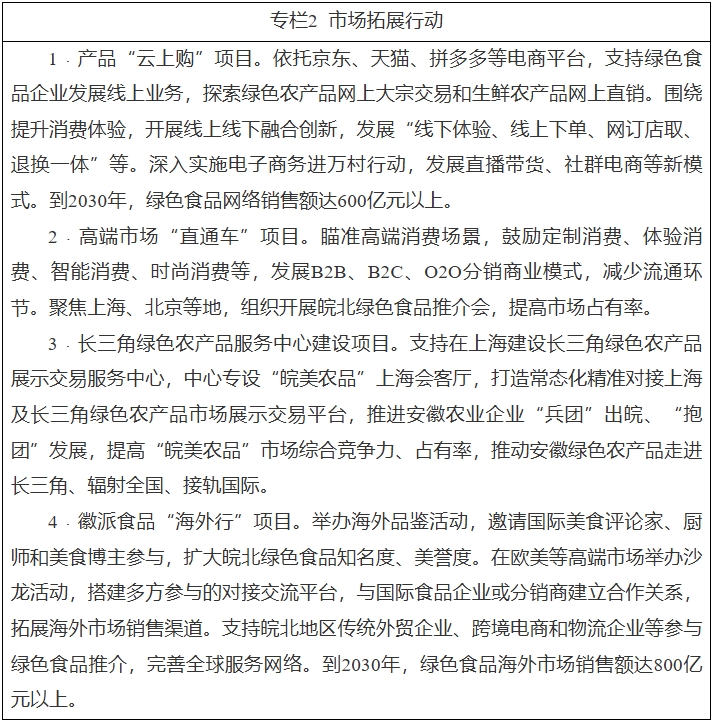 1. 打好国内国外“组合拳”。鼓励引导皖北龙头企业在长三角、京津冀、粤港澳大湾区等高端市场,开设各类旗舰店、体验店、形象店,提升市场认知度。鼓励在高速公路服务区、机场、高铁站、港口等流动人口密集场所,设立“皖美农品”展销专柜(区、店),拓宽产品销售渠道。推进“保税区”“保税仓”自由贸易平台建设。开拓国际高端市场,加强市场调查研究,根据当地需求和法规调整产品属性,建立安全可靠的“海外仓”等供应链体系。组织开展徽派食品“海外行”行动。到2030年,在长三角市场占有率达15%以上,国际绿色食品市场份额进一步提升。