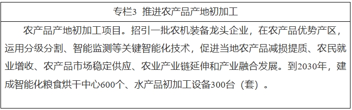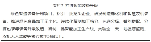 2﹒推进智能装备升级。扶持一批农产品加工装备研发机构和生产企业,开展信息化、智能化、工程化加工装备研发,提高关键装备国产化水平。运用智能制造、生物合成、3D打印等新技术,集成组装一批科技含量高、适用性广的加工工艺及配套装备,提升农产品加工层次。