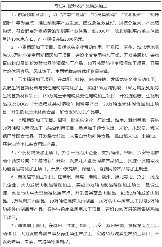 依托皖北粮食、畜禽、果蔬、水产、中药材等绿色优质原料资源禀赋,加强区域协同和产业上下游配套,促进优势特色产业转型升级。重点培育“品质粮食、优质蛋白、绿色果蔬、徽派预制菜、功能食品”五大绿色食品产业集群。