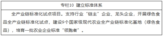 2﹒建立标准体系。推动绿色食品全产业链标准化,按照“有标采标、无标创标、全程贯标”的要求,加快产地环境、投入品管控、农兽药残留、产品加工、储运保鲜、分等分级等关键环节标准的制修订,推动建立现代农业全产业链标准体系。健全社会化服务体系,培育一批多元化、专业化农业社会化服务组织,开展农资配送、代耕代种、统防统治、烘干收储等生产托管服务,推动农业生产专业化、标准化、集约化。