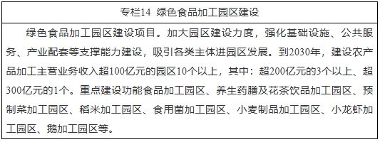 2﹒绿色食品加工园区建设。结合国家及省级现代农业产业园建设,加快园区科技集成、主体集中、产业集聚,推进主导产业“生产+加工+科技”全产业链开发。打造8个省级绿色食品产业示范园区,示范引领食品产业设施化、园区化、融合化、绿色化和数字化发展。各地按照“一县一园区”布局,建设绿色食品加工集聚区,实现“县县有园区、一园一特色”,形成绿色食品产业园区“8+N”的发展新格局。