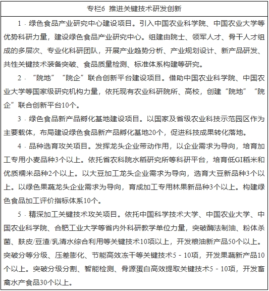 1﹒推进关键技术研发创新。引进中国农业科学院、中国农业大学、江南大学等优势科研力量,依托中国科学技术大学、合肥工业大学等省内科研教学单位和农业产业化龙头企业,整合创新资源,构建“1+10+N”绿色食品产业创新综合体(1个绿色食品产业研究中心、10个“院地”“院企”联合创新平台、N个新产品孵化基地)。发布绿色食品产业“卡脖子”技术需求清单,推行“揭榜挂帅”“赛马”制度,企业“出题”、科研机构“答题”。开展品种选育、新产品开发、智能装备研制、资源循环综合利用等协同攻关。