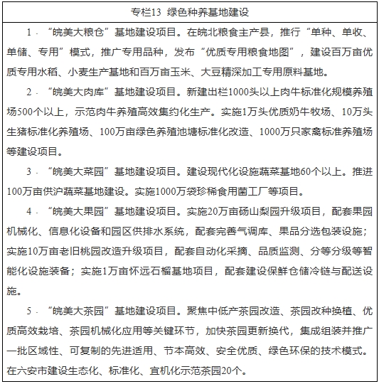 1﹒绿色食品原料基地建设。以县域为单位实施万亩以上整区域高标准农田建设项目,到2035年,将皖北地区永久基本农田全部建成高标准农田。按照小麦、玉米和水稻精深加工产品专用原料要求,推动皖北优质专用粮食基地建设,建成原料生产基地2000万亩以上。推动肉蛋奶、果菜茶等重要农产品生产供给基地建设,建成标准化、现代化、便利化的长三角“菜篮子”生产及流通服务体系。