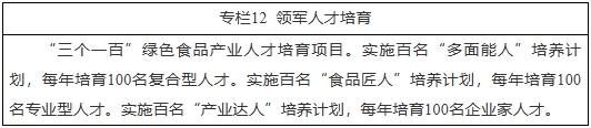 2﹒培育专业型人才。依托安徽现代肉牛产业学院、“新农人”协会等平台,加快培养一批符合绿色食品产业发展需求的科技人才和创新团队。围绕集群所需、市场所求、人才所要,分层、分级、分类开展培训,培育一批产品策划、包装设计、品牌规划、市场营销、电子商务、资本运作等绿色食品产业细分领域“操盘手”“职业经理人”等专业型人才。