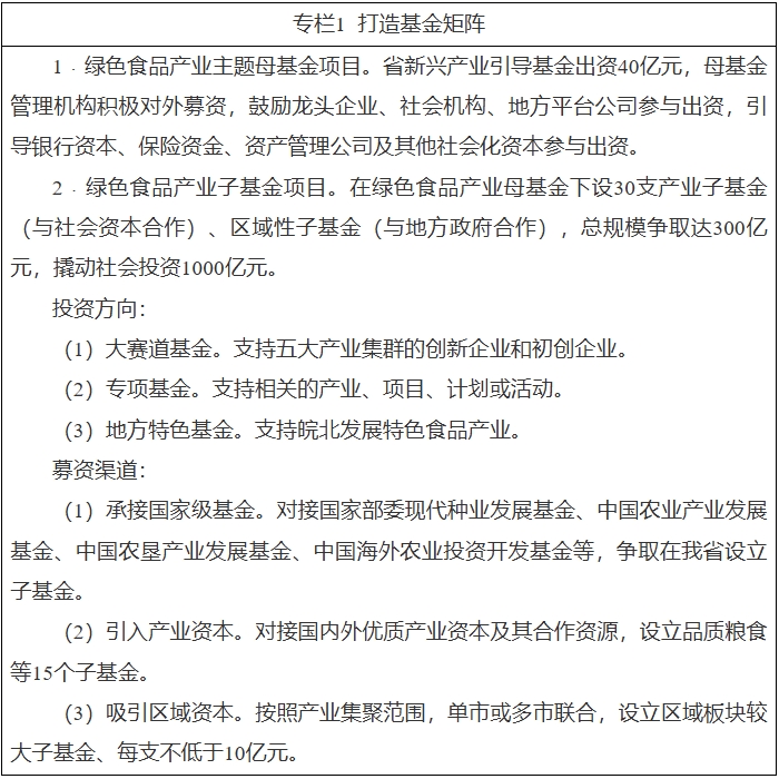 2. 打造基金矩阵。用好省级涉农母基金,进一步发挥省农业产业化发展基金、省供销合作发展基金等2个涉农母基金基础作用,支持皖北绿色食品产业集群建设。由省新兴产业引导基金、母基金管理机构和社会资本共同出资,成立绿色食品产业母基金和子基金。提高基金管理能力,通过专业化管理,设置财务目标,提高基金管理效率和专业能力,强化“募、投、管、退”等环节监督管理,实现社会效益与经济效益有机结合。