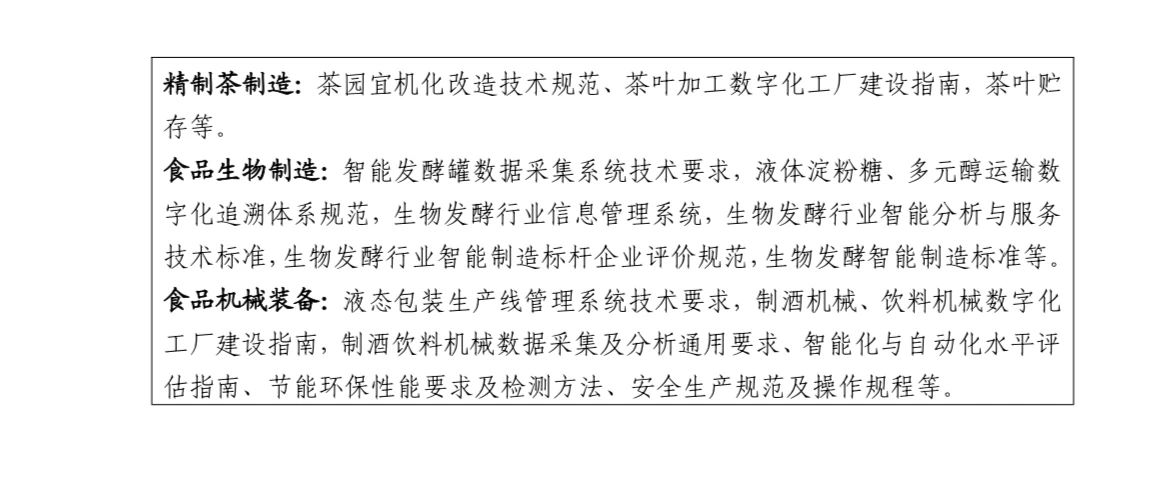 13.建立健全标准体系。推进食品工业数字化转型基础架构、技术应用、分级分类、实施指南、测试评价、互联互通,以及数据管理、数据质量、产品主数据等关键急需标准制修订,完善相关标准及细分领域系统运维、设备维护等服务规范,推动智能制造标准体系建设。支持行业组织牵头制定团体标准,加快国标、行标、团标协调配套,鼓励制定高于国标、行标的企业标准。开展标准宣贯,推动国标、行标进企业、进园区、进集群。深化与国际标准化组织合作,加强国际标准采标研判,推进标准外文版计划。